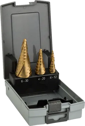 طَقم رُؤوس الثقب المتدرجة مصنوع من فولاذ HSS-TiN، ومزود بساق مستوية ثلاثية الجوانب