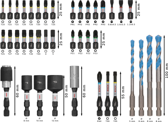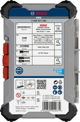 | 2 608 521 U85 | Schrauberbit 25 mm: PH1; PH2 (3x); PH3; PZ1; PZ2 (2x); PZ3; T10; T15 (2x); T20 (3x); T25 (3x); T27; T30 (3x); T40; H4; H5; SL4,5; SL5,5; SL6,5. Schrauberbit 55 mm: PH2; T20; T25. Stecknuss 50 mm: 8; 10; 13 mm. Bithalter 60 mm: Standard-Bithalter; Quick Change-Bithalter. EXPERT HEX-9 Multi Construction Bohrer: 5; 6; 8 (2x) mm. | 40 Stck | 78,26 EUR | Jetzt kaufen |
