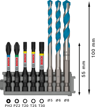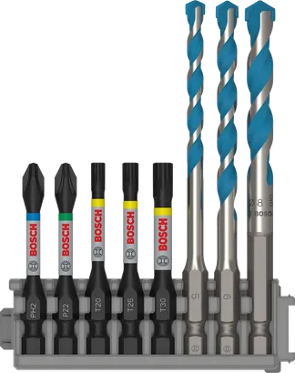 | 2 608 577 144 | Embout de vissage de 50 mm : PH2 ; PZ2 ; T20 ; T25 ; T30. Foret EXPERT HEX-9 Multi Construction : 5 ; 6 ; 8 mm. | 8 Unit. | 27,81 € | Trouver un revendeur local |