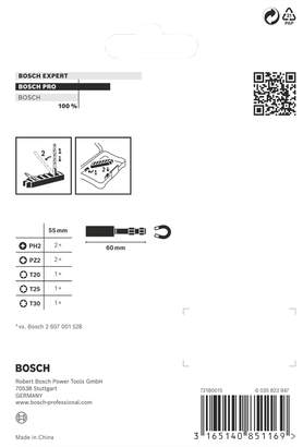 | 2 608 522 326 | PH2; PZ2; T20; T25; T30 | 60; 50; 50; 50 | 50 mm Schroefbit: PH2 (2x); PZ2 (2x); T20; T25; T30. 60 mm bithouder: Standaardbithouder. | 8 St. | 23,48 € | Verkrijgbaar bij onze partners |