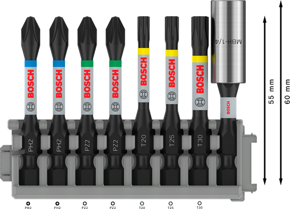 | 2 608 522 326 | PH2; PZ2; T20; T25; T30 | 60; 50; 50; 50 | 50 mm skruebit: PH2 (2x); PZ2 (2x); T20; T25; T30. 60 mm bitholder: Standard bitholder. | 8 Stk. | Køb nu |