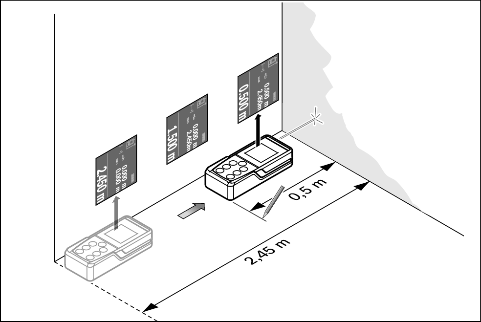 - Насочете измервателния уред, докато в реда с резултат (d) не се изобрази желаното разстояние.