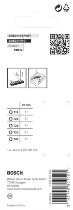 | 2 608 522 322 | T15; T20; T25; T30; T40 | 25; 25; 25; 25; 25 | Set contents: T15, T20 (2x), T25 (2x), T30 (2x), T40 | 8 Pcs | Find a local dealer | |