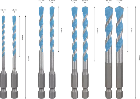 Zelo vsestranski svedri v tem kompletu lahko zaradi svoje ostre konice in napredne geometrijske zasnove natančno in brez zdrsavanja vrtajo v trde materiale, kot so ploščice in granit. Svedri so izdelani iz optimiziranega karbida z uporabo naše proizvodne tehnike finega brušenja ter so lahko kos tudi betonu, opeki, mehkim ploščicam, lesu in kovini. Delo bo z njimi vedno opravljeno profesionalno – ne glede na material.