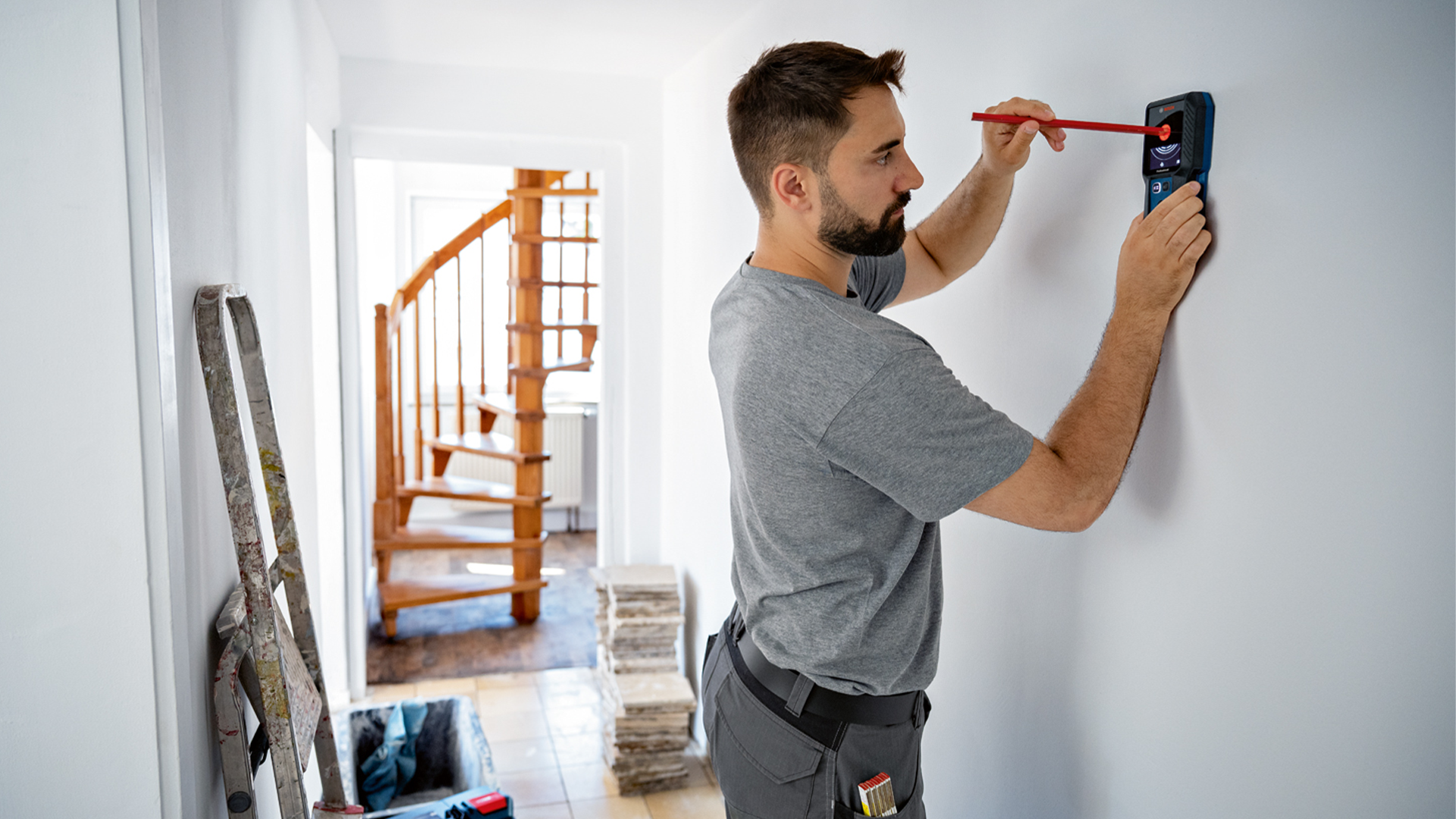 d. The 50–60 Hz signal from the electricity cable must be stronger along the cable than in its immediate vicinity. If the wall is very damp or poorly earthed, the signal will be the same strength throughout the wall. This will result in the measuring tool indicating that it has found a signal over a large area, but it will not be able to detect the exact location of the cable. In this instance, it may be helpful to place your free hand on the wall 20–30 cm from the measuring tool in order to conduct the signal away from the wall.However, you should not change the position of your free hand during the measuring process.
