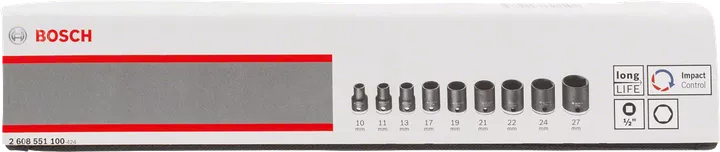 | 2 608 551 100 | 1/2 | 10; 11; 13; 17; 19; 21; 22; 24; 27 | 38 | 1. Set Content: 1/2 inch Shank; Width across flat 10 mm 2. Set Content: 1/2 inch Shank; Width across flat 11 mm 3. Set Content: 1/2 inch Shank; Width across flat 13 mm 4. Set Content: 1/2 inch Shank; Width across flat 17 mm 5. Set Content: 1/2 inch Shank; Width across flat 19 mm 6. Set Content: 1/2 inch Shank; Width across flat 21 mm 7. Set Content: 1/2 inch Shank; Width across flat 22 mm 8. Set Content: 1/2 inch Shank; Width across flat 24 mm 9. Set Content: 1/2 inch Shank; Width across flat 27 mm | 9 Pcs | Find a local dealer | |