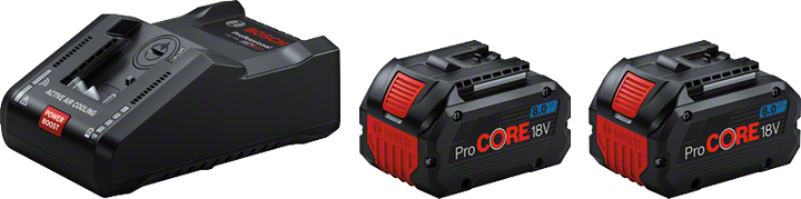 Two high performance ProCORE18V 8.0 Ah batteries for up to 2,000 W corded power and the ultra-fast charger GAL 18V-160 C are part of this set. This ProCORE18V batteries offer 87% more power compared to a conventional battery because of the latest cell technology with the 21700 cells and Bosch´s intelligent battery management. Additionally they are equipped with the COOLPACK 2.0 technology for superior heat management. This leads to a longer lifetime and runtime of the ProCORE18V batteries. The ultra-fast charger GAL 18V-160 C charges the ProCORE18V 8.0Ah battery up to 50% in incredible 15 minutes and up to 80% in 26 minutes. While using the Toolbox App, further charging modes, like long life and storage mode can be set. Battery health, remaining charging time are available via Toolbox App as well. Compatible with all tools and chargers of the Bosch Professional 18V System and the AMPShare Alliance.