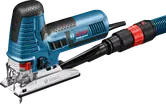 The GST 160 CE Professional also makes bevelled cuts and features a blower, an LED light, orbital action, precision control, speed selection, and tool-free SDS saw blade changes.