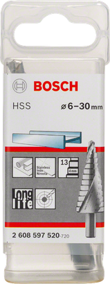 - A broca escalonada HSS efetua uma perfuração suave em vários diâmetros com uma broca