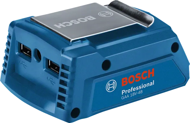 Das GAA 18V-48 Professional verwandelt Bosch 18V-Akkus in leistungsstarke USB-Ladeeinheiten mit 2 x 2,4 A Ladestrom. Durch sein kompaktes Design ist der USB-Ladeadapter leicht zu tragen und der Metallgürtelclip gewährleistet jederzeit griffbereite Energiereserven. Sein Koaxialstecker versorgt beheizbare Kleidung von Bosch mit Energie für schützende Wärme bei Arbeiten und Aktivitäten im Außenbereich.