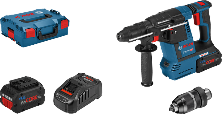 Dieses Elektrowerkzeug eignet sich zum Bohren und Meißeln in Beton, Mauerwerk, Holz und Metall. Es ist kompatibel mit verschiedenen Systemzubehören zur Staubabsaugung und mit allen Bosch Professional 18V-Akkus und -Ladegeräten (Professional 18V System). Auch kompatibel mit AMPShare, der markenübergreifenden Akku-Allianz.