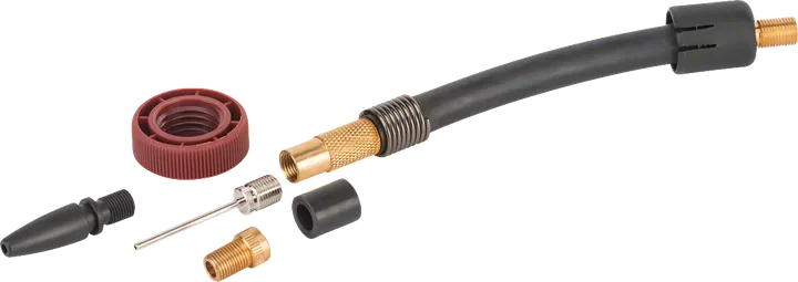 - Ce chargeur comprend un flexible, un écrou étanche, un joint en caoutchouc, des valves pour ballons, vélo et matelas
