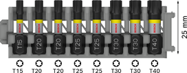 | 2 608 522 322 | T15; T20; T25; T30; T40 | 25; 25; 25; 25; 25 | Conteúdo do conjunto: T15, T20 (2x), T25 (2x), T30 (2x), T40 | 8 Pçs | Comprar no parceiro Bosch | |
