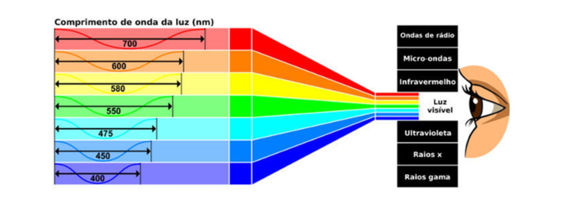 Nós enxergamos cores dentro do que chamamos de espectro de luz visível. Dentro dessa “faixa de cores”, temos nos extremos o vermelho e o violeta, que são cores que conseguimos enxergar. Mais ao extremo delas, temos o infravermelho e o ultravioleta que, por estarem ainda mais ao extremo desse espectro de luz visível, não são visíveis aos olhos humanos.