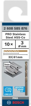 Broca helicoidal PRO Stainless Steel HSS-Co, 3 x 33 x 61 mm, 10 peças