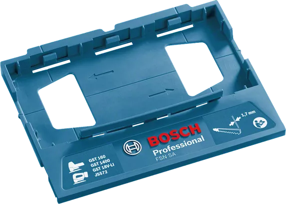 Der Adapter FSN SA Professional ermöglicht geführte Geradschnitte mit der Stichsäge auf der Führungsschiene. Für einfaches und zeitsparendes Arbeiten lässt sich die Stichsäge werkzeuglos an der Führungsschiene anbringen und wieder von ihr lösen. Dieser Adapter ermöglicht absolut präzise Geradschnitte und eignet sich für zahlreiche Stichsäge-Führungsschiene-Kombinationen, sowohl mit Bosch FSN Führungsschienen als auch Systemen von Mafell und Festool. Der Adapter kann mit den Stichsägen GST 160 Professional, GST 140 Professional, GST 18V-LI Professional, GST 18V-LI S Professional, GST 18V-LI B Professional, GST 18V-155 Professional und GST 18V-125 Professional verwendet werden.