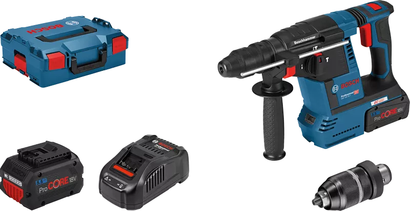 Questo utensile è concepito per lavori di foratura e scalpellatura nel calcestruzzo, nella muratura, nel legno e nel metallo. È compatibile con vari accessori per l’aspirazione della polvere, nonché con tutte le batterie e tutti i caricabatteria Bosch Professional da 18 V (Professional 18V System). Compatibile anche con AMPShare, l’alleanza di batterie multimarca.