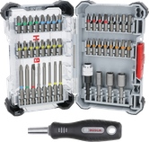 | 2 607 017 733 | 240,0 x 41,0 x 307,0 | 25 mm Screwdriver Bit: PH1; PH2 (2x); PH3; PZ1; PZ2 (2x); PZ3; T10; T15; T20 (2x); T25; T27; T30; T40; T10H; T15H; T20H (2x); T25H; T27H; T30H; T40H; T10H; T15H; T20H (2x); T25H; T27H; T30H; T40H; SL3; SL4; SL5; SL6. 65 mm Screwdriver Bit: PH2; PZ2; T15; T20; T25; H3; H4; SL6. 50 mm Nutsetter: 6; 8; 10 mm. 60 mm Bit Holder: Quick Change Bit Holder. 125 mm Screwdriver Handle: 125 mm Screwdriver Handle. | 45 Pz. | 49.33 CHF | Trova un rivenditore in zona |