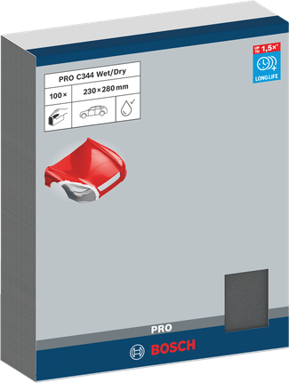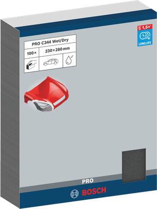 Vyrobili jsme brusný papír PRO C344 wet and dry pro ruční broušení za mokra a za sucha, abychom pomohli profesionálům v oblasti autoservisů a také malířům a tesařům docílit skvělého povrchu, který potřebují. Papíry mají odolná zrna karbidu křemíku pro dlouhotrvající výkonnost. Navíc používáme papír s příměsí latexu, abychom zajistili jejich pružnost a voděodolnost. To znamená, že jsou vhodné pro mokré i suché broušení: Můžete si být jisti, že se nerozlomí a nepoškrábou povrch.