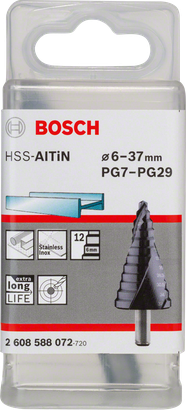 - Stupňovitý vrták HSS AlTiN provádí hladké vrtání různých průměrů jediným vrtákem