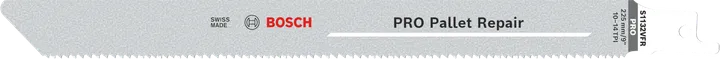 La lame PRO Pallet Repair S1132VFR est conçue pour une coupe endurante, confortable et à faibles vibrations. La conception innovante du stabilisateur d'emmanchement de Bosch accroît significativement la robustesse, la pointe inversée empêchant les secousses et la flexion de la lame due aux impacts frontaux, tandis que la lame combine des dents en acier HSS trempé et un corps très flexible en acier HCS.