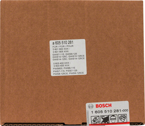 | 1 605 510 281 | GWS 7-115 (0 601 800 0..), GWS 10-125 C (0 601 802 3..), GWS 10-125 CE (0 601 803 5..), GWS 14-125 C (0 601 804 5..), GWS 14-125 CE (0 601 805 5..) Professional, PWS 6-100 (0 603 401 0..), PWS 6-115 (0 603 401 0..), PWS 7-125 (0 603 399 8..), PWS 8-125 CE (0 603 404 6..), PWS 9-125 CE (0 603 405 6../0 603 405 9..), PWS 13-125 CE (0 603 348 6../0 603 348 7..), PWS 600 (0 603 400 0..), PWS 850 CE (0 603 404 7..) | 125 | 1 Unit. | 77,30 € | Disponible chez nos partenaires |