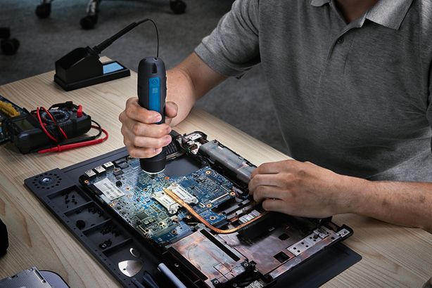 This compact, precision power tool securely holds most types of bits for screwdriving into wood, metal, or plastic