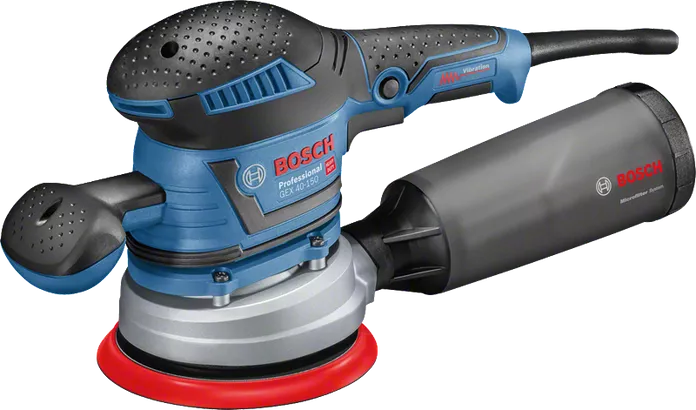 This tool also includes a dust box with a built-in Bosch Micro Filter System, a 150 mm sanding pad fitted with a hook-and-loop system for fastening sanding sheets, speed selection and Vibration Control.