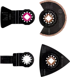 Our multi-tool kits contain carefully selected extensions to increase the versatility of your oscillating tools. Routers, scrapers and cutters are individually selected accessories for particular performance. Packaged in useful 3 to 8-piece multi tool sets. 3-piece tile set for tile and bathroom applications. 5-piece cutting set for sawing in wood and metal. Mounting system for fast, hands-free changing of blades. No job is too big or too small when you use our multitool attachments. Expand the versatility of your multitools with attachment kits from Bosch.