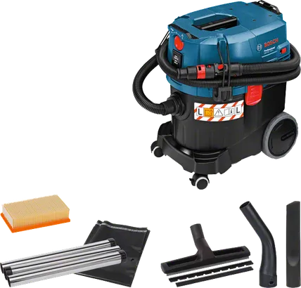The GAS 35 L SFC+ Professional is Bosch's corded, L-class wet and dry dust extractor with a convenient semi-automatic filter cleaning (SFC+) system. This system enables quick and easy onehanded filter cleaning for faster, uninterrupted work progress. It has an L-class dust extractor certification in accordance to EU standards, ensuring good user protection. It also features an extremely powerful 1,380 W suction turbine, providing 254 mbars of very high vacuum pressure for the best extraction results. This dust extractor is intended for wet and dry vacuuming. It is compatible with the Bosch Click & Clean System.