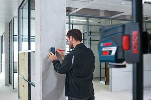 Bosch LR 6 receiver with LED display for laser leveling tool.