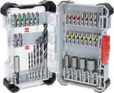 | 2 607 017 730 | „PRO Wood“ medienos grąžto antgalis: 3 (2 vnt.); 4; 5; 6; 8 mm cilindrinis medienos grąžto antgalis. 25 mm atsuktuvo antgalis: PH1; PH2 (2x); PH3; PZ1; PZ2 (2x); PZ3; T10; T15; T20 (2x); T25; T27; T30; T40; H3; H4; H5; H6; SL3; SL4; SL5; SL6. 50 mm veržliaraktis: 6; 8; 10; 13 mm. 55 mm antgalių laikiklis: Standartinis antgalių laikiklis. | 35 Vnt. | Rasti prekybos atstovus |