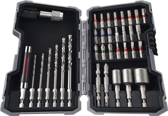 | 2 607 017 328 | PH1, PH2, PH3; PZ1, PZ2, PZ3; S 3/4/5/6; H3, H4, H5, H6; T10, T15, T20 (2x), T25, T27, T30, T40; Išdrožos 8/10/13 mm; HSS-G 2,5/3,0/3,5/4,0/5,0/6,0 mm; Dvigubos geležtės PH2/PZ2; Dvigubos geležtės Th20/Th25 | PH1; PH2; PH3; PZ1; PZ2; PZ3; SL3; SL4; SL5; SL6; HEX3; HEX4; HEX5; HEX6; TH10; TH15; TH20; TH25; TH27; TH30; TH40 | 25; 25; 25; 25; 25; 50; 70; 74; 83; 88; 99; 105; 60; 60 | Rinkinyje yra: PH1, PH2, PH3, PZ1, PZ2, PZ3, S 3/4/5/6, H3, H4, H5, H6, T10, T15, T20 (2x), T25, T27, T30, T40, varžtų galvutė 8/10/13 mm, HSS-G 2,5/3,0/3,5/4,0/5,0/6,0 mm, dvigubas antgalis PH2/PZ2, dvigubas antgalis Th20/Th25 | 35 Vnt. | Rasti prekybos atstovus |