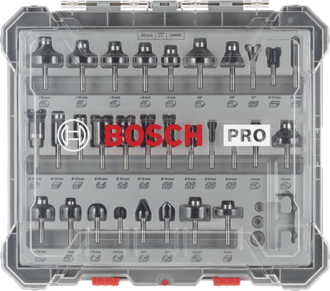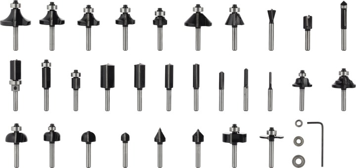 Les fraises incluses dans le kit de fraises mixtes PRO, 30 pièces, sont dotées de fraises en carbure de haute qualité brasées au corps en acier pour plus de solidité, de durabilité et de précision. Les fraises à rainurer droit sont dotées d'une fraise supplémentaire à l'extrémité pour des coupes plongeantes en douceur. La fraise avec un bord de coupe allongé de 30 mm vous permet de couper des rainures très profondes. Toutes les fraises sont marquées au laser avec les détails techniques et de sécurité afin que vous puissiez les trouver facilement quand vous en avez besoin. Le coffret est livré dans un étui en plastique solide conçu pour vous aider à retirer les fraises plus facilement et en toute sécurité. Il comprend une clé hexagonale et 3 roulements à billes - au cas où vous auriez besoin de remplacer un roulement usé.