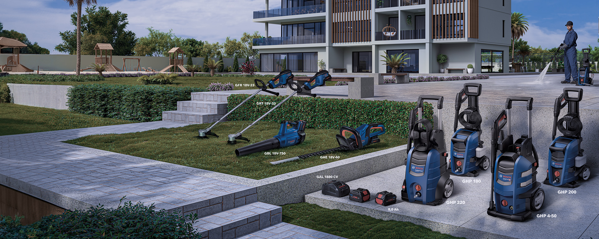 Recortar, cortar, soplar y limpiar con la potencia de Bosch, con la nueva gama de herramientas para jardinería y mantenimiento de edificios. Las nuevas limpiadoras de alta presión proporcionan una limpieza eficiente con hasta un 80 por ciento menos de consumo de agua que los métodos de limpieza manual, y las herramientas de jardinería con batería ofrecen más rendimiento con su sistema de batería de 18V.