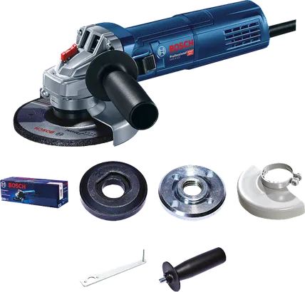 Bosch GWS9-125 angle grinder with accessories.