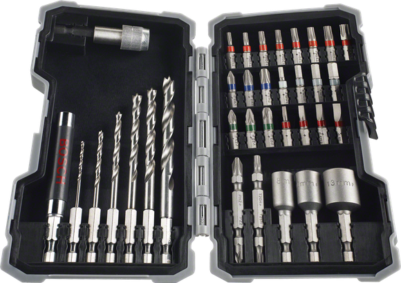 | 2 607 017 327 | PH1, PH2, PH3; PZ1, PZ2, PZ3; S 3/4/5/6; HEX 3/4/5/6; TH10, TH15, TH20 (2x), TH25, TH27, TH30, TH40; Nutsetter 6/8/10 mm; HSS 2.0/3.0/4.0/5.0/6.0/8.0 mm; Double blade PH2/PZ2; Double blade Th20/Th25 | PH1; PH2; PH3; PZ1; PZ2; PZ3; SL3; SL4; SL5; SL6; HEX3; HEX4; HEX5; HEX6; TH10; TH15; TH20; TH25; TH27; TH30; TH40 | 25; 25; 25; 25; 25; 50; 67; 72; 87; 97; 102; 112; 60; 60 | Set Content: PH1, PH2, PH3, PZ1, PZ2, PZ3, S 3/4/5/6, HEX 3/4/5/6, TH10, TH15, TH20 (2x), TH25, TH27, TH30, TH40, Nutsetter 6/8/10 mm, HSS 2.0/3.0/4.0/5.0/6.0/8.0 mm, Double blade PH2/PZ2, Double blade Th20/Th25 | 35 Pcs | Find a local dealer |