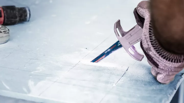 A person wearing safety equipment cuts plasterboard with a reciprocating saw blade.