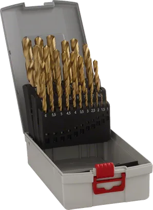 | 2 608 587 015 | 1.00; 1.50; 2.00; 2.50; 3.00; 3.50; 4.00; 4.50; 5.00; 5.50; 6.00; 6.50; 7.00; 7.50; 8.00; 8.50; 9.00; 9.50; 10.00 | 12; 18; 24; 30; 33; 39; 43; 47; 52; 57; 57; 63; 69; 69; 75; 75; 81; 81; 87 | ProBox metal HSS-TiN (titanium coating) drill bit set: 172 x 115 x 42 mm, 19 pcs Included diameters (mm): 1; 1,5; 2; 2,5; 3; 3,5; 4; 4,5; 5; 5,5; 6; 6,5; 7; 7,5; 8; 8,5; 9; 9,5; 10 Included working lengths (mm): 12; 18; 24; 30; 33; 39; 43; 47; 52; 57; 57; 63; 69; 69; 75; 75; 81; 81; 87 | 19 Pcs | Find a local dealer |