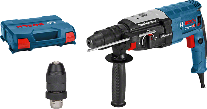The GBH 2-28 F Professional with a quick-change chuck is the strongest tool within the Bosch 2 kg SDS plus corded rotary hammer category. Its robust motor delivers an outstanding 3.2 J of impact energy for high-power drilling performance. The rotary hammer also features KickBack Control for increased user protection and Vibration Control for effortless and continuous work in time-intensive applications.