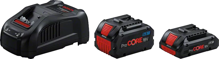 Detta är kombinationen av det kompakta och lätta ProCORE18V 5.5Ah för upp till 2 000 W kabeldriven effekt och det lätta ProCORE18V 4.0Ah. Tack vare den senaste celltekniken med 21700 celler och den intelligenta batterihanteringen från Bosch ger ProCORE18V-batterier 87 % mer effekt än ett vanligt batteri. För att säkerställa en längre livslängd och batteritid har detta batteri COOLPACK 2.0-teknik med en överlägsen värmehantering. GAL 1880 CV ingår i satsen för snabb laddning. Denna snabbladdare behöver endast 32 minuter för att ladda ett ProCORE18V upp till 80 % och endast 35 minuter för att ladda ett ProCORE18V 8.0Ah upp till 80 %. Kompatibel med alla verktyg och laddare i Bosch Professional 18V System och AMPShare Alliance.