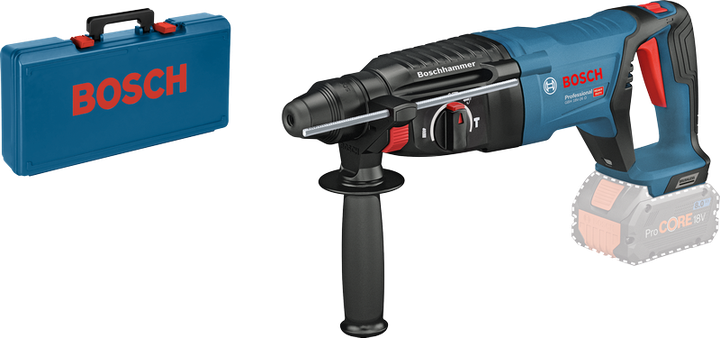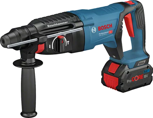 Denna sladdlösa borrhammare med D-handtag är det perfekta allroundverktyget i Boschs SDS plus-kategori. Den har höga prestanda, särskilt för vertikal borrning och mejsling. Med en slageffekt på 2,5 J – som levereras av dess underhållsfria, borstlösa motor – ger den dig en sladdlös effekt som kan jämföras med effekten hos etablerade tryckluftsborrar med kabel från Bosch. Som den första sladdlösa tryckluftsborren med D-handtag med KickBack Control ger den dig både flexibel hantering och ökat användarskydd. Arbetet blir ännu mer bekvämt tack vare den effektiva LED-belysningen som belyser mörka arbetsutrymmen, den stora, lätthanterliga brytaren samt D-handtaget som är extra bekvämt vid mejsling. Denna tryckluftsborr är avsedd för borrning och mejsling i betong och murverk. Den är kompatibel med dammtillbehör GDE 16 Plus Professional och GDE 68 Professional liksom med alla Bosch Professional 18 V-batterier och laddare (Professional 18V System). Även kompatibel med AMPShare, batterisamarbetet mellan flera märken.