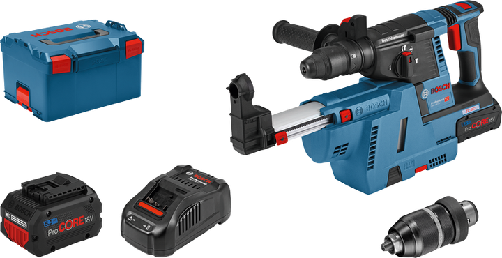 Detta verktyg är avsett för att borra och bila i betong, murverk, trä och metall. Det är kompatibelt med olika systemtillbehör för dammutsug och med alla Bosch Professional 18V-batterier och 18V-laddare (Professional 18V System). Även kompatibel med AMPShare, batterisamarbetet mellan flera märken.