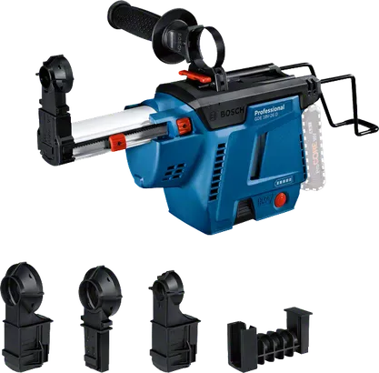 Dammutsuget 18 V GDE 18V-26 D fungerar oberoende och ger dammfritt, mobilt arbete för bekvämt och snyggt resultat vid många olika typer av borrning. Det kan eftermonteras för användning med många olika vanliga kabeldrivna och sladdlösa borrhammare från Bosch Professional och har fyra utbytbara dammkåpor för fix- eller snabbchuckar och borrbits på upp till 26 mm i diameter, liksom en förlängning för bits på upp till 265 mm i längd.