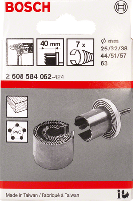 | 2 608 584 062 | 25; 32; 38; 44; 51; 57; 63 | 7 | 40 | 1. Contient : Diamètre (mm) 25 ; Profondeur de coupe (mm) 40 2. Contient : Diamètre (mm) 32 ; Profondeur de coupe (mm) 40 3. Contient : Diamètre (mm) 38 ; Profondeur de coupe (mm) 40 4. Contient : Diamètre (mm) 44 ; Profondeur de coupe (mm) 40 5. Contient : Diamètre (mm) 51 ; Profondeur de coupe (mm) 40 6. Contient : Diamètre (mm) 57 ; Profondeur de coupe (mm) 40 7. Contient : Diamètre (mm) 63 ; Profondeur de coupe (mm) 40 | 7 Unit. | Trouver un revendeur local |