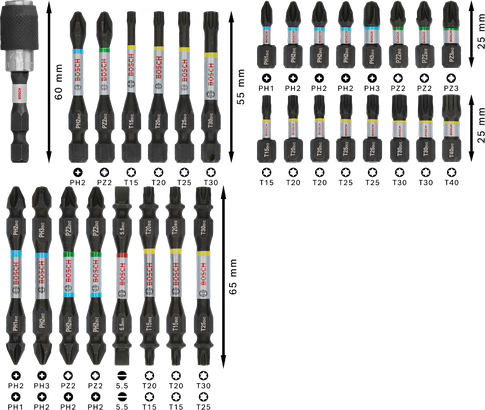 | 2 608 521 U71 | 25 mm Screwdriver Bit: PH1; PH2 (3x); PH3; PZ2 (2x); PZ3; T15; T20 (2x); T25 (2x); T30 (2x); T40. 55 mm Screwdriver Bit: PH2; PZ2; T15; T20; T25; T30. 65 mm Screwdriver Bit: PH1/PH2; PH2/PH3; PH2/PZ2 (2x); T15/T20 (2x); T25/T30; SL1 x 5.5/SL1 x 5.5. 60 mm Bit Holder: Quick Change Bit Holder. Pick and Click box-in-box: Box-in-box. | 31 Pcs | Find a local dealer |