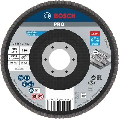 The PRO X571 Flap Disc has an X-cloth backing for stable grinding. The advanced grain fusion of aluminium oxide and zirconia offers fast stock removal and makes this flap wheel efficient, even when you use it on hardened steel.
