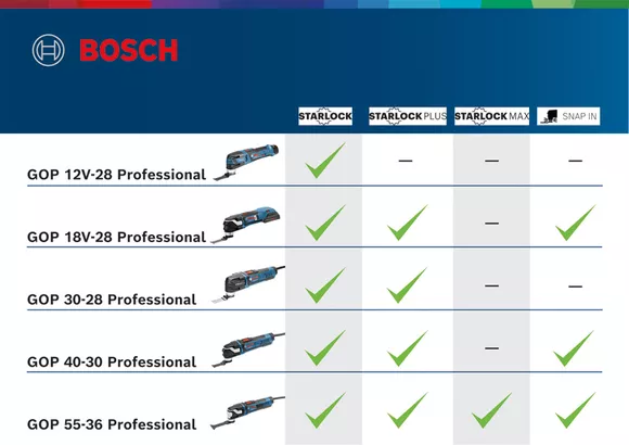 The GOP 30-28 Professional corded multi-tool offers the best price-to-performance ratio in the Bosch StarlockPlus category. It features a 300 W motor combined with a superior Starlock interface with an optimised 3-dimensional tight-fitting connection between the machine and accessory for the highest possible power transmission. Furthermore, the multi-tool's small ergonomic handle grip provides comfortable handling and better tool control. It also has a magnetic mounting enabling easy accessory changes.