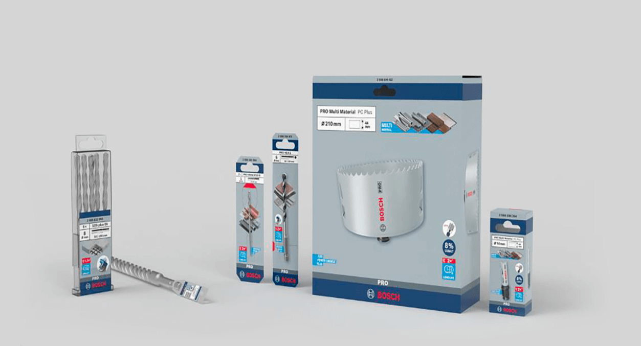 Envase y marcado de productos rediseñados. Orientamos a los usuarios hacia la elección correcta y les explicamos los beneficios de los productos de alto rendimiento a través de su aplicación en los materiales y su clase de rendimiento: Bosch, Bosch PRO o Bosch EXPERT