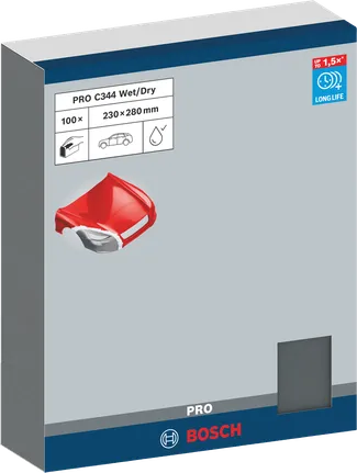 We made the PRO C344 wet and dry Hand Sanding Sheet to help car repair professionals, painters, and carpenters get the great finish they need. The sheets feature strong silicon carbide grains for long-lasting performance. Plus, we use a latex paper backing to make sure they are flexible and waterproof. This means they are suitable for wet and dry sanding: you can be sure they won't break and scratch the surface.